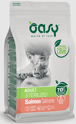 Cat foods are available for kittens, adult cats, and for seniors. Oasy offers grain free food, cat food without chicken, food for weight control, hairball formulas, and food for sterilized cats.