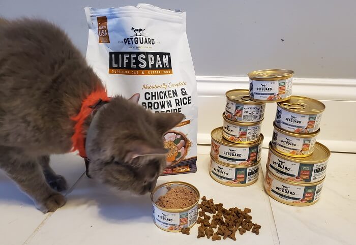 To test PetGuard cat food, we ordered a bag of their LifeSpan Chicken & Brown Rice Recipe with Vegetables dry food and an assortment of canned foods.