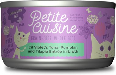 | Petite Cuisine L’il Violet’s Tuna, Pumpkin & Tilapia Entrée in Broth Grain-Free Wet Cat Food | Wet | Tuna | 23 kcal/oz | $0.53 per oz | B |
