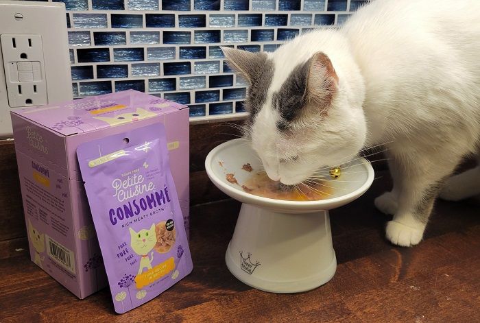 To test Petite Cuisine, I ordered a 12-can variety pack and a box of the Consommé Tuna Recipe in Broth Grain-Free wet food topper. My cats are suckers for any cat food made with fish – especially wet food. They go crazy as soon as I open the can and they can’t eat it fast enough. Petite Cuisine was no different.