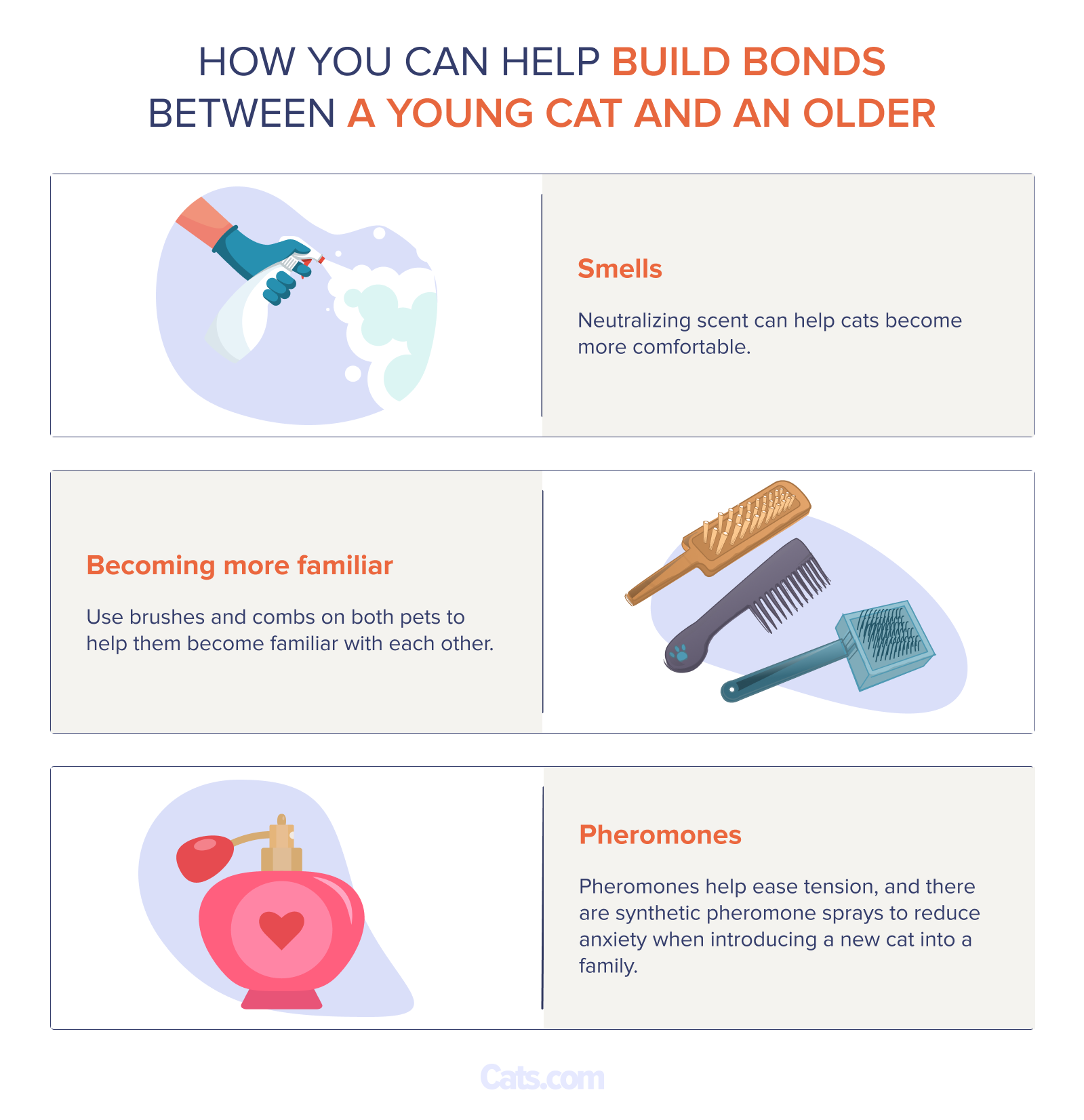 A new cat can bring a new scent, foreign behaviors, and disrupt routine. Cat owners can help build bonds between a young cat and an older cat several ways. Neutralizing scent can help cats become more comfortable.