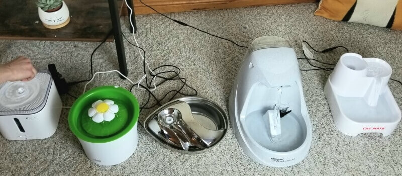 We started with the Flower fountain. It was a fast-fail since it was plastic and was quick to cause breakouts and couldn’t stay clean enough. Tried another plastic one. My mistake. We now have a very large ceramic fountain that works very well, but is too large for me to handle for cleaning.