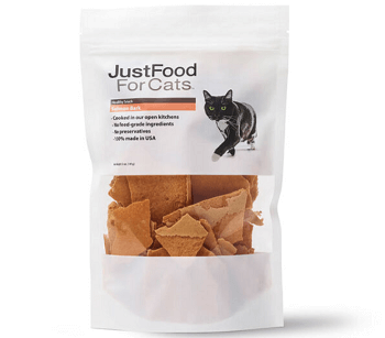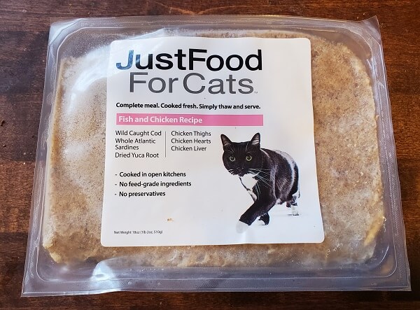 Just Food for Cats offers a single fresh frozen cat food recipe made with fish and chicken. Here’s what they have to say about it on their website: