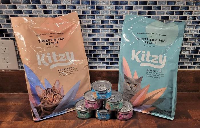 Kitzy’s cat food selection includes both wet and dry food varieties. There are two dry food recipes and nine wet food formulas. Kitzy’s dry food formulas are made with either turkey or whitefish and peas.