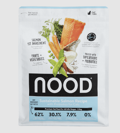| Nood Sustainable Salmon Recipe with Probiotics for Cats | Dry | Salmon | 3,500 kcal per kg | £1.96 per lb | C- |