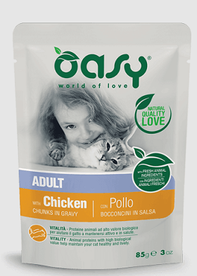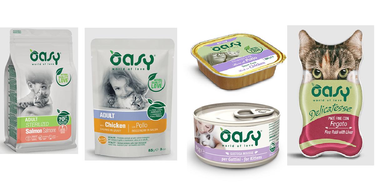 Cat foods are available for kittens, adult cats, and for seniors. Oasy offers grain free food, cat food without chicken, food for weight control, hairball formulas, and food for sterilized cats.