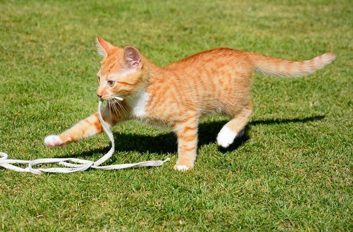 Although it’s often irresistible to play with kittens by wriggling your fingers or toes, this isn’t an appropriate method of play. From day one, direct your kitten’s play onto lifeless objects like ping pong balls, scrunched-up paper, catnip mice, and fishing pole-type toys, where a person moves a wand while the kitty pursues the toy dangling from the tip of the wand. Always supervise kittens with such toys to reduce the entanglement risk if left alone.
