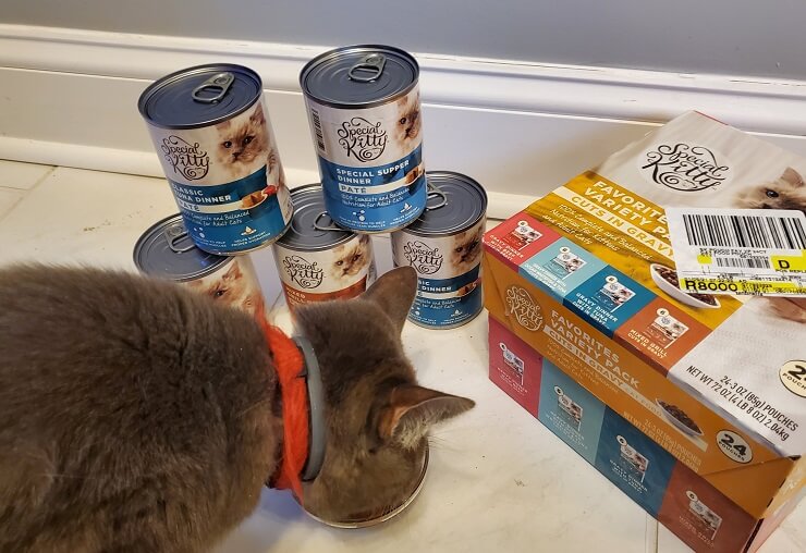 In terms of their wet food offerings, Special Kitty has 5.5-ounce cans as well as larger 13-ounce cans. Though you may be able to purchase individual cans in-store, Walmart.com generally sells Special Kitty canned food in variety packs and multi-packs.