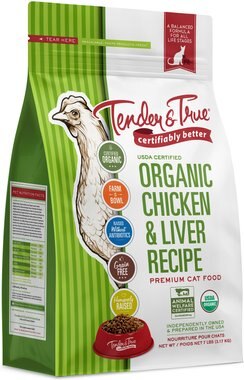 | Tender & True Organic Chicken & Liver Recipe Grain-Free Dry Cat Food | Dry | Chicken | 350 kcal/cup | $4.67 per lb | B |