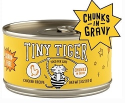 There are a few types of Tiny Tiger cat food in the lineup—chunks in gravy, chunks in extra gravy, and paté. Aside from their line of crunchy treats, all of their foods are high-moisture products packed into cans. If you’re looking for kibble cat food, you won’t find it from Tiny Tiger.