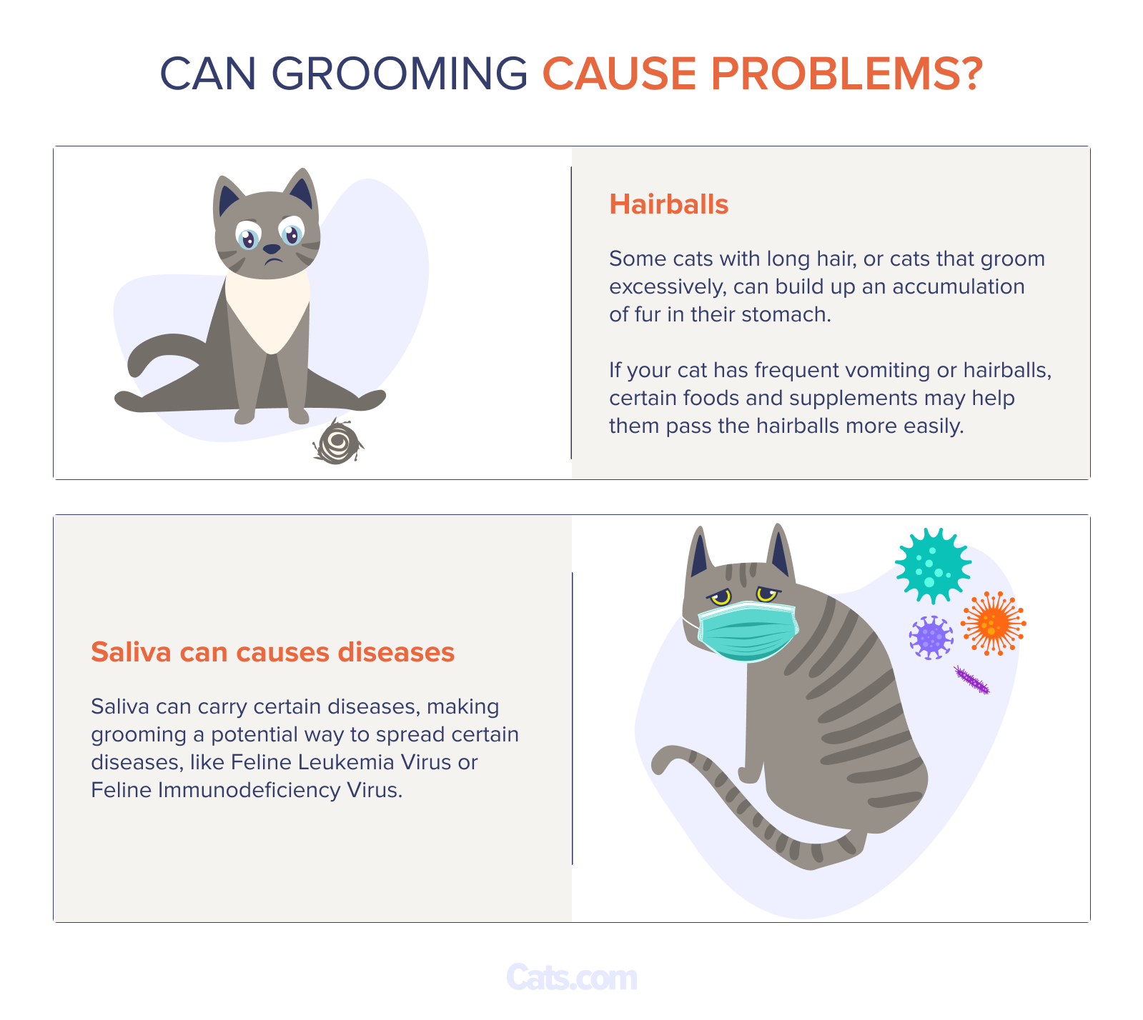 The most common condition due to grooming is hairballs. As cats groom themselves and each other, their tongue picks up fur. They swallow the fur, which usually passes through their digestive tract without problem.